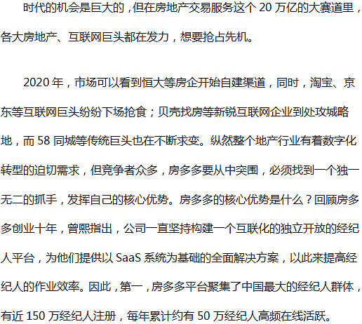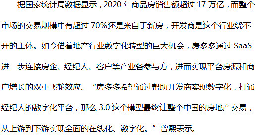 站在创业新的十年, $房多多(DUO)$ 想做的事一直没有变:深度赋能产业互联网化、数字化,实现产业上下游系统的融会贯通、资源的有效利用,降本增效,提升全产业链数字化。在房地产行业数字化进程全面加速的背景下,“中国最大的独立第三方经纪平台”房多多正在迎来公司历史上的第三次变革。房多多联合创始人兼联席CEO曾熙在近日给混沌大学做的一次演讲课中透露,2020年的最后一个季度,房多多正式进入到3.0阶段。在新的阶段,房多多将通过提供房云SaaS——全场景数字化营销解决方案,帮助开发商实现数字化转型。