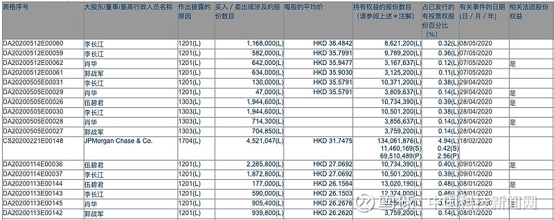 同一日,郭战军减持63.4万股,每股均价35.9港元,套现金额2276万港元;肖华减持64.2万股,每股均价35.9港元,套现2304万港元。