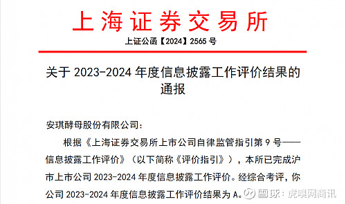 10月9日,上海证券交易所发布了《沪市上市公司2023至2024年度信息披露工作评价结果》,安琪酵母获最高评级A级。此次参评的上市公司共2,247家,评级为A的公司425家,占比仅为18.91%。