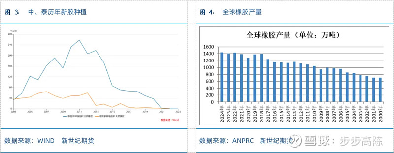 原因在于:2005年至2012年,ANRPC成员国尤其是泰国、中国、印尼和越南大力推广种植橡胶。尤其在2011年天然橡胶价格达到历史高位后,新增种植面积也跟随达到历史顶峰。橡胶树的生长周期较长,这批新种植胶树进入产胶期后,就相对稳定地向市场释放产能,全球橡胶产量持续增加。同时,全球经济增长开始放缓,导致供需失衡,胶价被压制于低位。