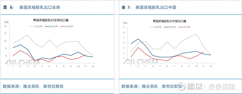 全年来看,泰国浓乳全年出口同比大幅下滑,主要原因在于在泰国产出不稳定的背景下,欧盟颁布EUDR法案,抬高了胶价,高利润促使泰国加工厂积极生产干胶,大量胶水分流至干胶产线,且胶水价格居高不下。因此2024年泰国浓乳出口中国份额减少,国内企业对国产浓乳依赖度增加。