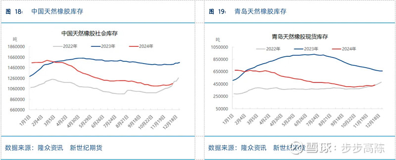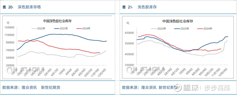 截至2024年12月29日,中国深色胶社会总库存为69.4万吨,环比增加1.2%。其中青岛现货库存增1.6%;云南增3%;越南10#增4%;NR库存降6%。中国浅色胶社会总库存为54.2万吨,环比降0.12%。其中老全乳胶环比降1.1%,3L环比增5%,RU库存小计增1.1%。