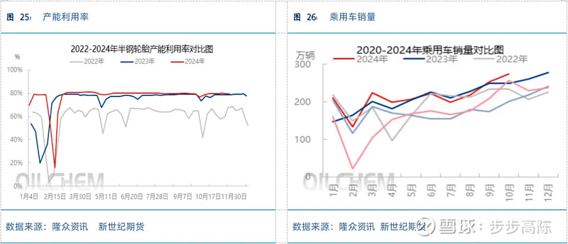 今年轮胎消费的三驾马车(配套、出口、替换)表现良好,使得轮胎开工率居高不下。尤其半钢轮胎产能利用率多数时间维持在80%左右的高位,2023年开始半钢轮胎一直保持“产销两旺”的态势。