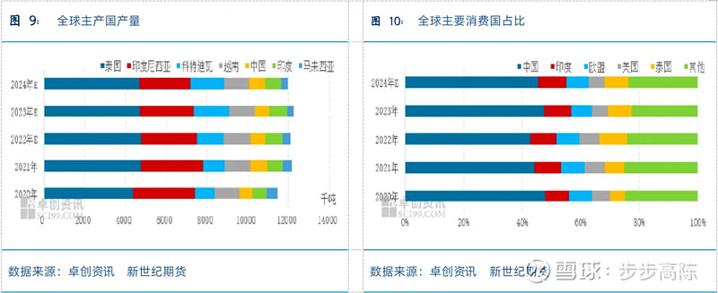 目前产胶国产量占比为:泰国的产量约占全球总产量的33.46%,印度尼西亚占21.86%,越南占8.62%,科特迪瓦占8.37%,中国占5.95%4。