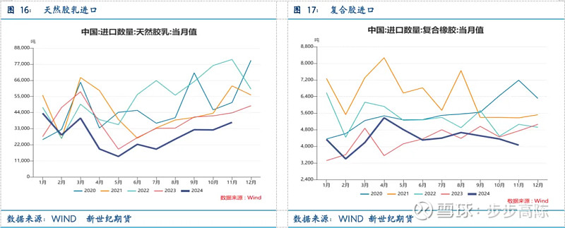 据海关数据统计:1-11月中国进口天然及合成橡胶(含胶乳)共计649.8万吨,较2023年同期的722.9万吨下降10.1%。随着EUDR法案推迟,到中国市场数量增加。2024年11月中国进口天然及合成橡胶(含胶乳)合计71.2万吨,较2023年同期的68.5万 吨增加3.9%。进口显著下降是导致市场供应偏紧的重要原因。