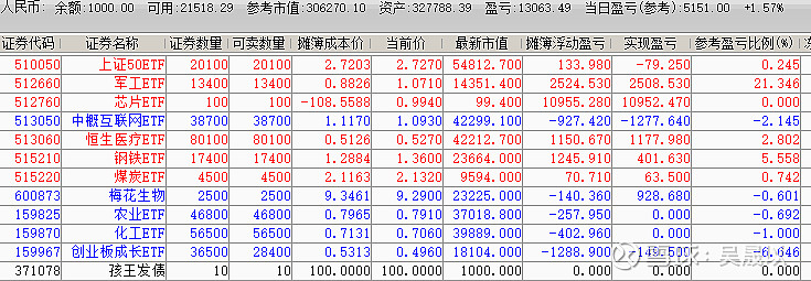 今日账户主要持有$上证50ETF(SH510050)$ 、$中概互联网ETF(SH513050)$ 、恒生医疗、化工、农业、钢铁、创成长、军工、煤炭等9个ETF。