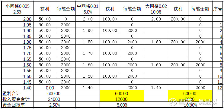 上涨2.56%、5.3%、10.6%卖出1笔2000元,合计卖出12、6、3笔,合计卖出获利分别为600、600、600元。