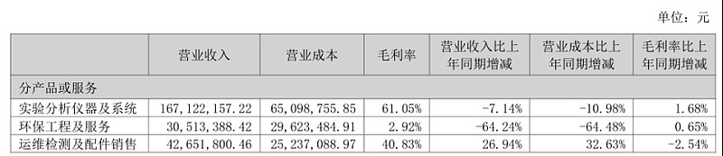 首先看营业收入3个季度比较平均,但与去年相比有较大的下滑,不用担心,这是由于这PPP项目财务处理方式的造成的,公司的几个PPP项目建造期结束,PPP带来的营收变少是正常的。主要看仪器业务下图(来自于中报),实验分析仪器及系统营收与去年微降,但毛利率微升。