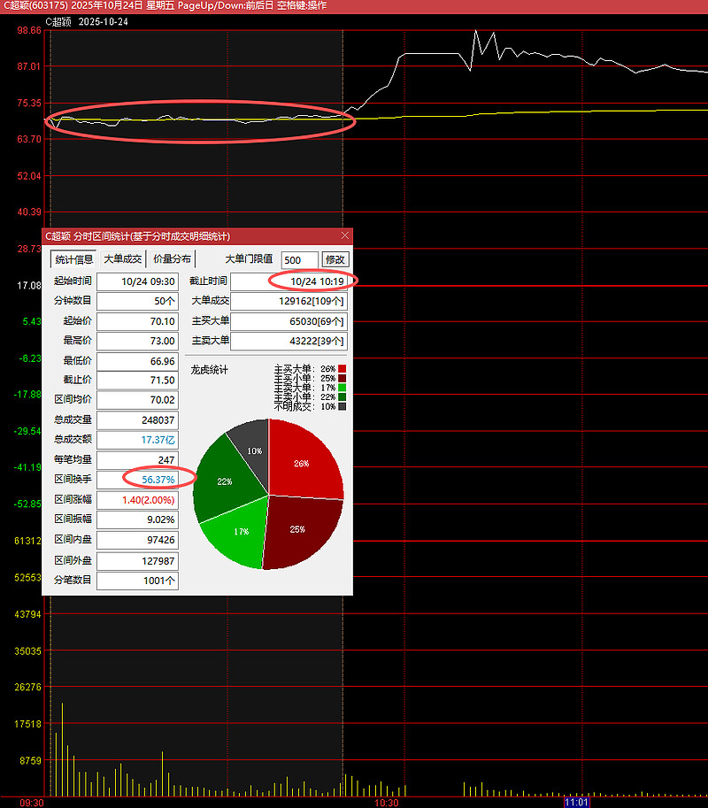 交易口诀不知道大家是不是还记得,10点前换手到40%以上,10:30换手到50%,上午换手到60%,这三个时间节点一定要看换手,到不了不要去买。最好的是波动小换手就可以到。C超颖 603175就是这周情况,所以可以往上临停。