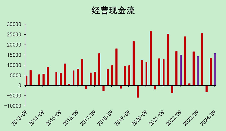 三季度经营现金流为15621亿元,去年同期为14173亿元,同比上升,强于上一个季度的变化。