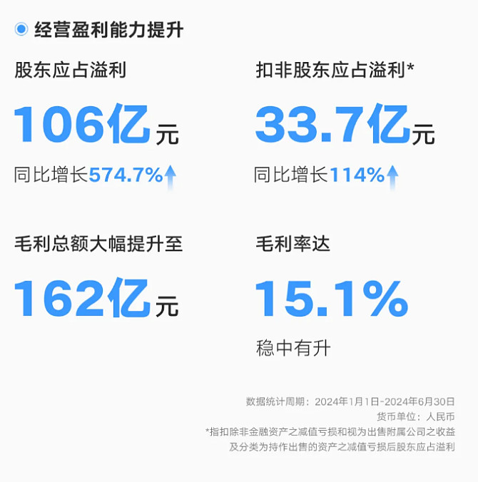 集团经营盈利能力显著提升:上半年股东应占溢利106亿元,同比大增574.7%;实现扣非股东应占溢利33.7亿元,同比增长114%;毛利总额大幅提升至162亿元,毛利率达15.1%。
