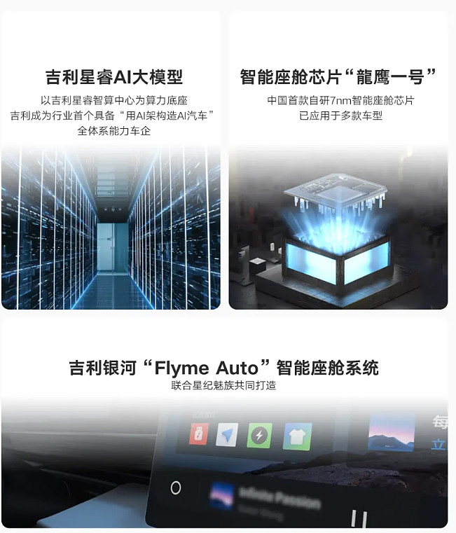 在智能化方面,今年5月30日,吉利汽车发布了联合星纪魅族共同打造银河的“Flyme Auto”智能座舱系统。人工智能上,以吉利星睿智算中心为算力底座的自研基础大模型——吉利星睿AI大模型正式发布,吉利成为行业首个具备“用AI架构造AI汽车”的全体系能力的车企。中国首款自研7nm智能座舱芯片"龍鹰一号",已在吉利银河E5率先搭载。