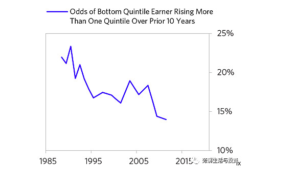他们越来越陷入贫困。下面的图表显示了一个人在10年内从收入最低的五分位数上升到收入最高的五分位数的几率。这种可能性从1990年的23%左右下降到2011年的14%。