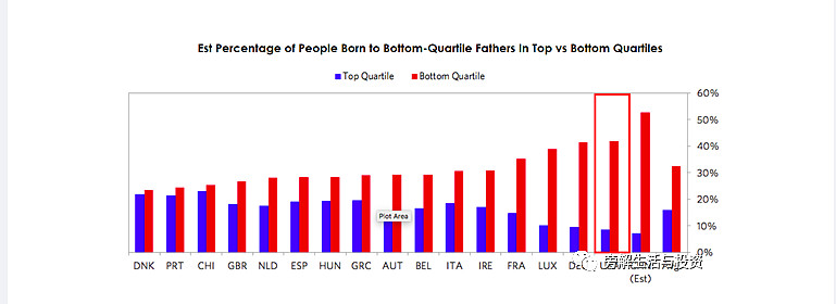 尽管大多数美国人认为美国是一个拥有巨大经济流动性和机遇的国家,但美国的经济流动性目前是发达国家中最差的之一。如下图所示,在美国,父亲处于收入最低的四分之一的人有40%的机会保持在那个四分之一,只有8%的机会进入最高四分之一,这是上升平均概率的一半,也是被分析的国家中最糟糕的概率之一。在一个机会均等的国家,这是不可能存在的。