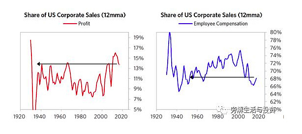 由于这两种力量的作用,收入中转化为利润的份额相对于工人的份额有所增加。下面的图表显示了自1929年以来公司收入中利润所占的百分比和员工薪酬所占的百分比。