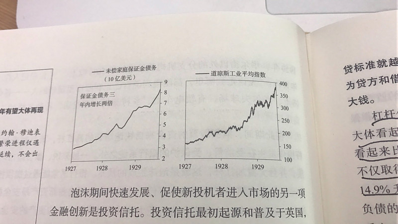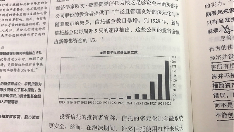 泡沫期,促进投资者进入市场的另一个金融创新是:投资信托。这些投资信托相当于向投资者募集资金,然后分散化投资多个公司,到1929年,新的信托基金以每周近5只的速度推出。投资信誉哦称,多元化让金融系统更安全,在泡沫期,为了跑赢市场,许多信托使用杠杆来房贷回报率。