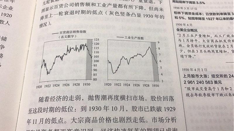 1930年下半年,经济明显开始走弱,5月-12月,百货公司销售额下降8%,工业产能下降17.6%,全年,失业率上升10%,达到14%,产能利用率下降12%,达到67%,住房和抵押贷款债务大幅度下降,经济接近轻度衰退。