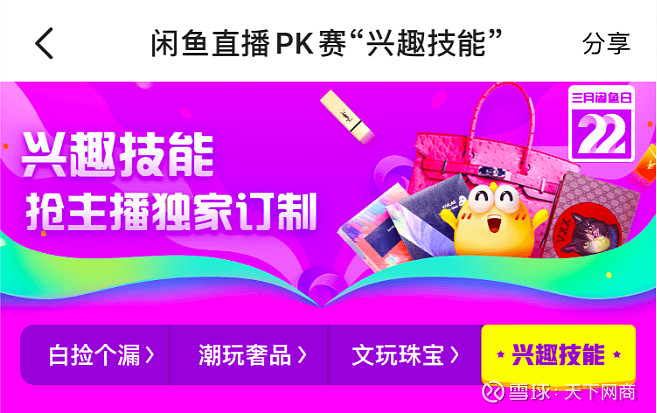 每月22日的“闲鱼日”,旨在打造一个具有个人特色,以兴趣为中心的乐趣“捡漏”大集市。正如闲鱼CEO闻仲所言:互联网时代,一般消费品已唾手可得,但每个人心中其实都有一座集市。“闲鱼日”的目标,就是鼓励更多用户参快乐参与闲置物流通,力争成为人人都能来赶集的热闹地、全世界最有意思的网络集市。