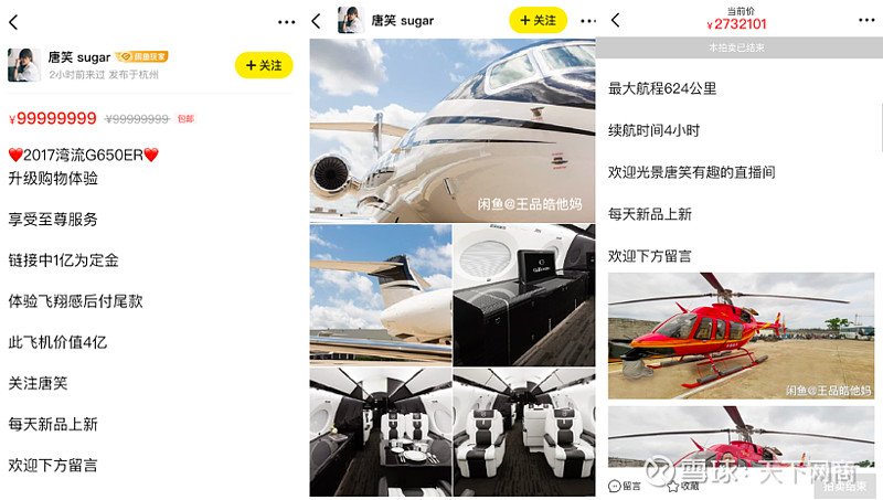 22日,闲鱼迎来第二个“闲鱼日”。记者了解到,在这个“闲鱼日”,闲鱼明星玩家唐笑在闲鱼直播开卖价值4亿元的2017湾流G650ER飞机。尽管这架公务机目前暂无人拍下,但一位浙江用户在经过1441轮出价后,豪气拍下另一家贝尔407直升机,成交价为273.2万元。