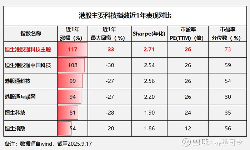 高纯度也决定了高锐度。Wind数据显示,截至9月17日,恒生港股通科技主题指数近1年涨幅117.28%,sharpe年化2.71,远高于同期其他主流科技指数表现。