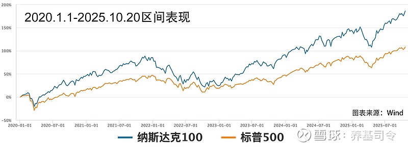 两者对比之下,纳斯达克100长期表现更牛,波段弹性也更好!Wind统计显示,2020.1.1-2025.10.20区间,纳斯达克100上涨187.88%,区间年化波动率为25.8%;标普500上涨108.47%,区间年化波动率为21.08%。