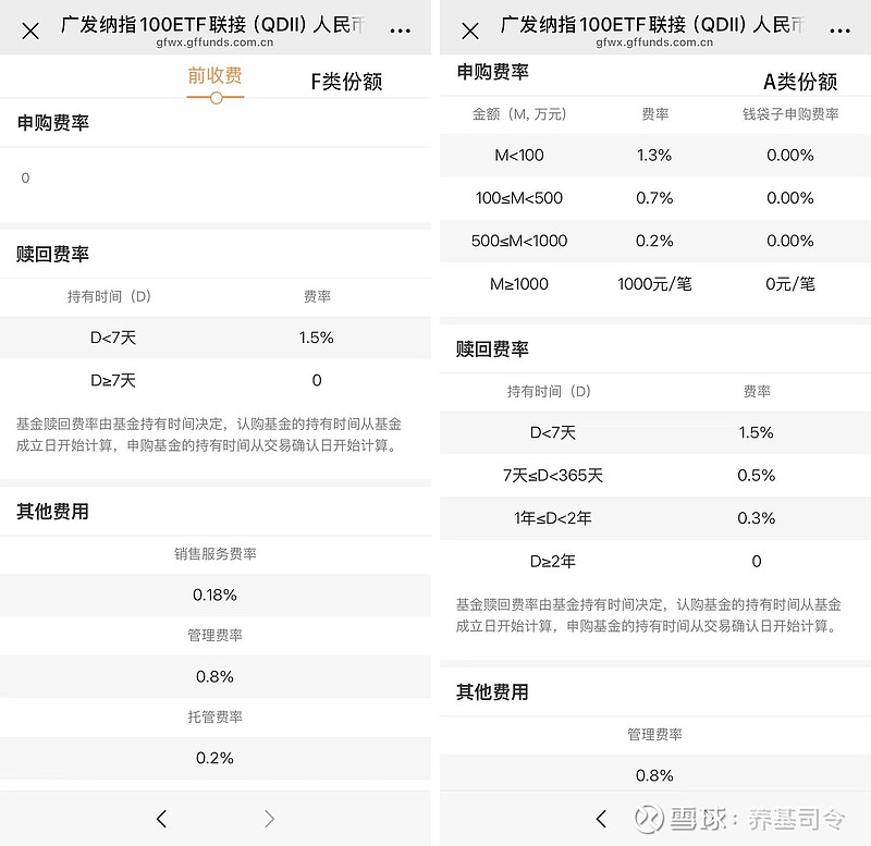 广发基金官方APP或者微信公众号上,纳指部分产品的销售服务费率为0.18%(其他平台的产品是0.2%),申购费为0,持有满7天免赎回费,比较适合波段持有者。如果打算长期持有,A份额同样0申购费,持有两年免赎回费,而其他销售平台可能需要收取申购费。