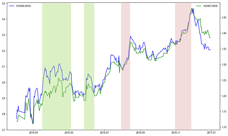 直观上而言,这些追踪同一指数的基金价格应该具有相同的波动,然而事实并非如此。下面的图1是华泰柏瑞300ETF(510300.SH)与兴全300LOF(163407.SZ)在2016年2月1日至2017年1月1日的价格走势图(左纵轴对应510300.SH的价格,右纵轴对应163407.SZ的价格)。尽管两只基金都追踪的是沪深300指数,但在图中绿色框体区间,两只基金场内价格会呈现出不同走势,价格偏离程度较大。这可能是因为流动性、节假日等诸多因素。