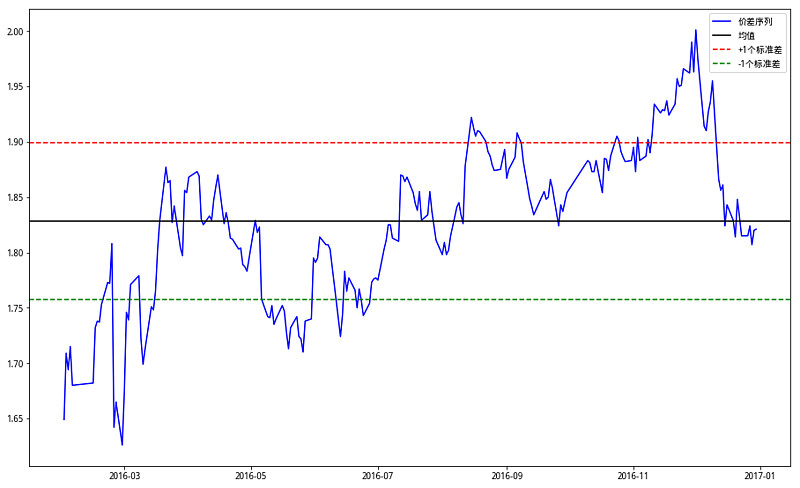 搬砖策略最关键的参考指标是两只基金的价格差异程度。这个可以通过基金价差序列的标准差来衡量。具体参考下面图2,图中的蓝色曲线是两只基金在2016年2月1日至2017年1月1日之间的价差(510300.SH的价格减去163407.SZ的价格),中间黑色实心线是价差的平均值,上面的红色虚线距离平均值一个正的标准差(这个值为1.9);下面的绿色虚线距离平均值一个负的标准差(这个值为1.76)。