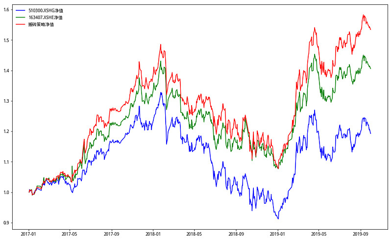运用上述简单策略,我们在2017年1月2日到2019年9月30日之间进行实验。图3是回测实验结果,其中蓝色曲线为单纯持有华泰柏瑞300ETF的净值,绿色曲线为单纯持有兴全300LOF的净值,红色曲线为采用搬砖策略的净值(实验过程已经考虑交易手续费)。