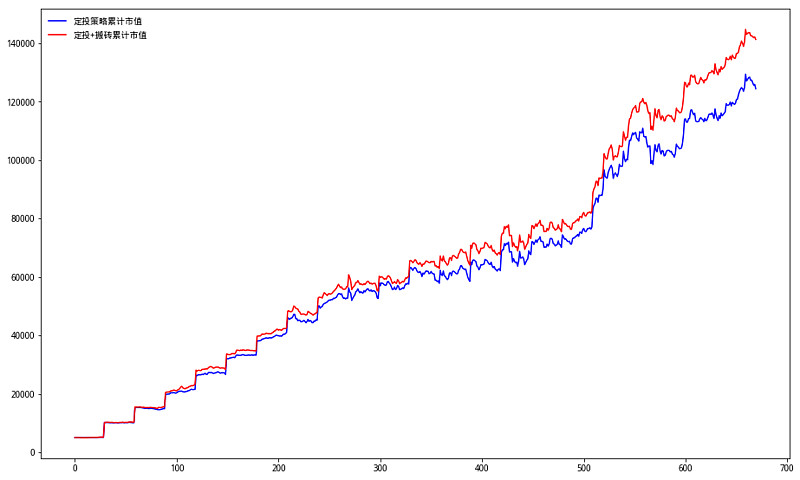 我们仍旧使用第2节给出的搬砖策略,同时加入每个月投入5千元的定投策略,在2017年1月2日到2019年9月30日时间段内采用上述混合策略进行回测。图4是回测实验结果,其中蓝色曲线为单纯定投华泰柏瑞300ETF的累计市值,红色曲线为加入搬砖策略后的累计市值。