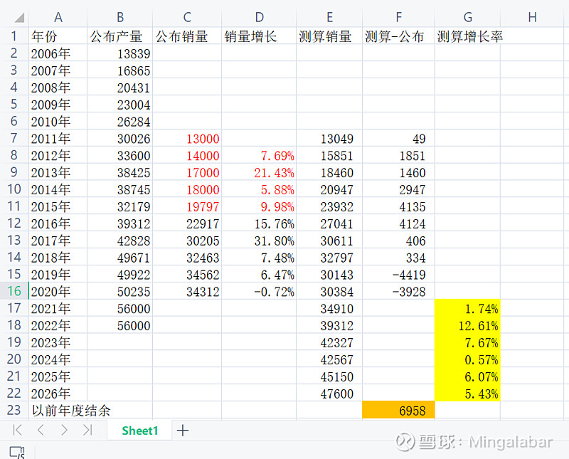 下表的公布产量来自年报,2016年年报中公布销量,2011-2015年销量数据为笔者判断。测算销量为【(4年前产量+5年前产量)/2*85%】计算得出,测算-公布指测算销量与公布销量之间的差额。