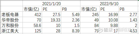 快2年过去了,现在回头看,错得太离谱. 万和是涨的不错,但主要是最近炒作空气能热泵概念. 老板却是跌的最多的.华帝2021年恢复的很好.美大现在市场还是给了和老板一样的高的PE. 所以选择股票只看一年是远远不够的。
