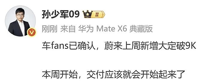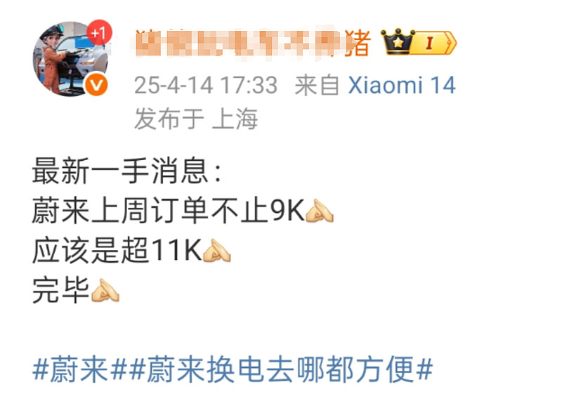 上周就预言蔚来销量起飞,不过没准确信息还真不敢断言,这不,渠道大V出来实锤了:新政实施后单周大定怒冲9000台。本来从各个门店的进店量反馈就能知道要爆单,没想到比预期的订单更高,私信了一个蔚来销售,他直言:连上厕所都要小跑。天啦噜,这泼天的富贵终于轮到蔚来!