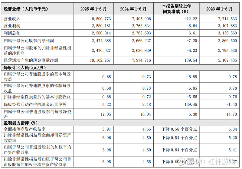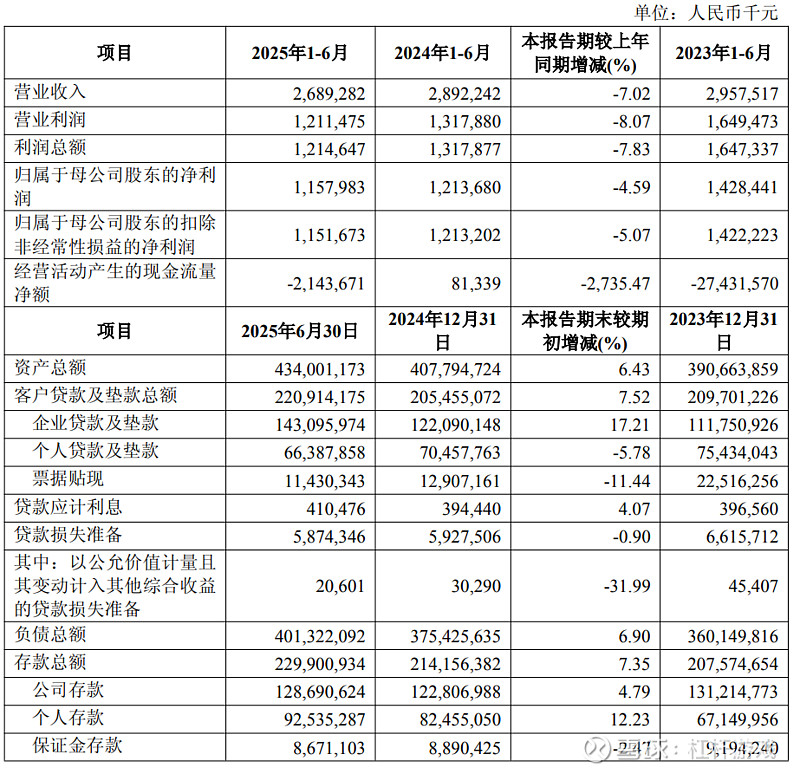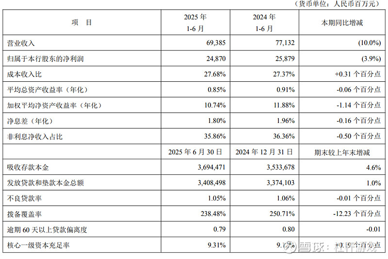 贵阳银行作为贵州省唯一的省级城商行,其命运与区域经济深度绑定。2025年上半年,该行营收和利润的下滑幅度在五家银行中均居于前列。报告期内营业收入65.01亿元,同比大幅下降12.22%;归母净利润24.74亿元,同比下降7.2%。