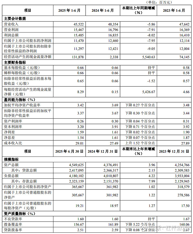 2025年华夏银行营业收入455.22亿元,同比下降5.86%;归属于上市公司股东的净利润114.70亿元,同比下降7.95%。和平安银行不一样,华夏银行的利润跌速比营收快。