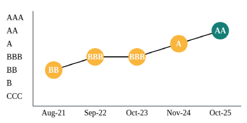 近日,国际权威指数机构摩根士丹利资本国际公司(明晟、MSCI)更新2025年度环境、社会及治理(ESG)评级信息,平安银行凭借在ESG领域的卓越表现,评级一举跃升至AA级,在短短五年内实现了从BB级到AA级的三级跃升。这一突破,彰显了平安银行在可持续发展道路上的坚定决心与强大实力,标志着其在国际金融舞台上赢得了高度认可。