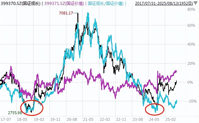 2024年8月,成长跑输价值的幅度(蓝线)就和2018年底差不多了,之后市场风格逐渐转到“成长占优”上。