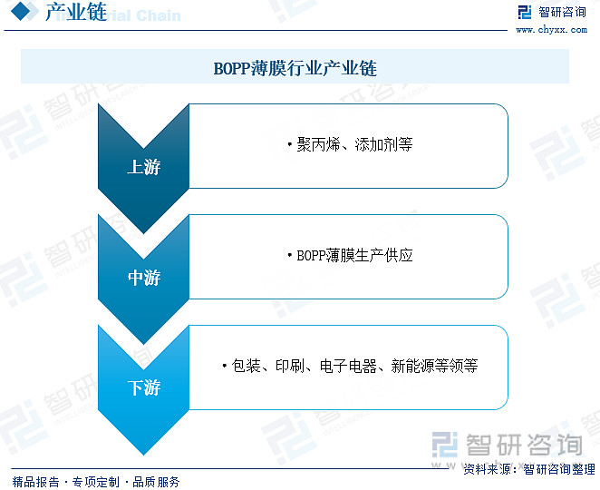 BOPP薄膜行业产业链上游为原材料供应环节,为聚丙烯、添加剂等;中游为BOPP薄膜生产供应环节;下游主要应用于包装、印刷、电子电器、新能源等领域。