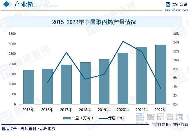 聚丙烯(PP)为BOPP薄膜直接原材料,聚丙烯的供应情况很大程度上决定了我国聚酯薄膜行业的发展。近年来,我国聚丙烯产能持续扩张,产量也随之不断增长。据资料显示,2022年我国聚丙烯产量为2965.5万吨,同比增长3.7%。