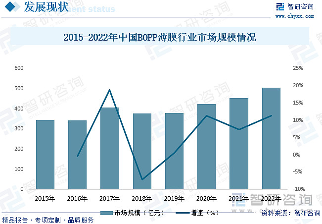 我国BOPP薄膜行业起步于20世纪80年代,随着我国经济的快速发展,BOPP薄膜的市场需求急速增长,国内BOPP薄膜的产品售价持续攀高,众多企业开始进军BOPP薄膜行业,BOPP薄膜行业规模开始扩张。此外,随着我国BOPP行业技术的不断成熟以及市场对BOPP薄膜的性能提出了越来越高的要求,我国BOPP薄膜行业应用边界不断拓宽,进一步推动了行业的发展。据资料显示,2022年我国BOPP薄膜行业市场规模约为504.5亿元,同比增长11.3%。