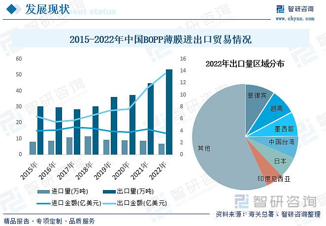 从行业进出口贸易方面来看,我国BOPP薄膜行业主要以出口贸易为主。随着近年来我国BOPP薄膜行业的快速发展,行业生产规模的不断扩张,使得我国BOPP薄膜在满足国内市场需求的同时,还能大量出口。具体来看,2022年我国BOPP薄膜行业进口量为6.95万吨,同比下降21.7%,进口金额为3.63亿美元,同比下降15.6%;出口量为53.29万吨,同比增长19%。出口金额为13.54亿美元,同比增长22%。