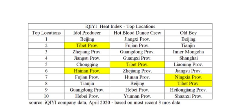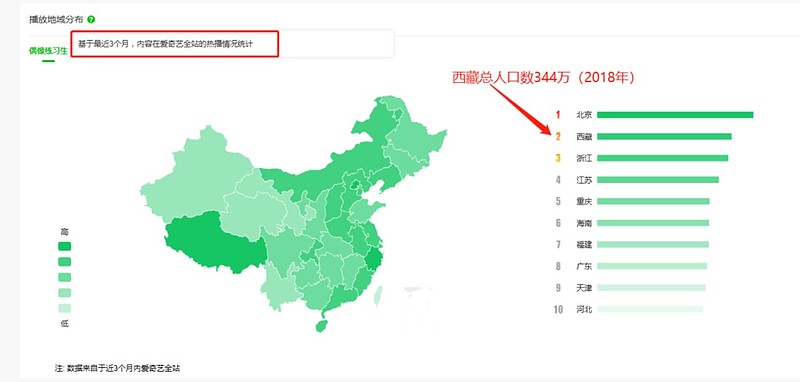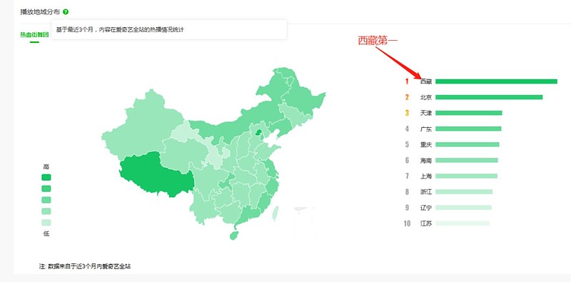 但是,我还是不得不说,爱奇艺的数据中台,可能有问题,这个热力图本身,如何解释西藏为什么可以排名第一呢?麻烦解释一下。