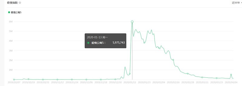 爱情公寓的峰值,是符合剧播出的时间,绝对数也比较大接近600万;