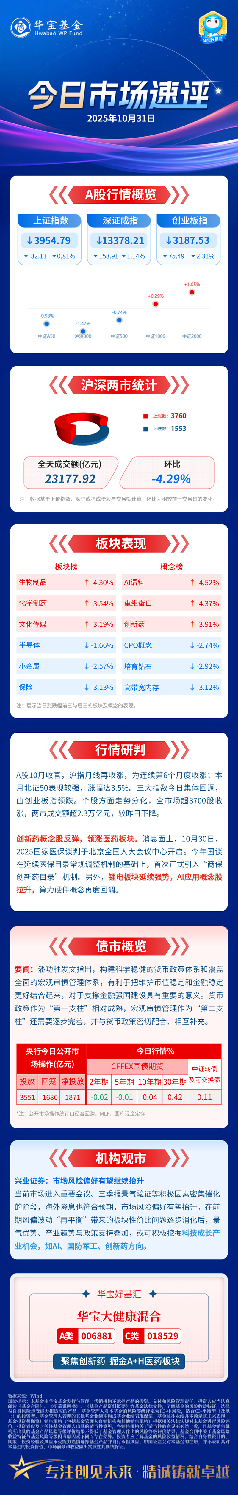 A股10月收官,沪指月线再收涨,为连续第6个月度收涨;本月北证50表现较强,涨幅达3.5%。三大指数今日集体回调,由创业板指领跌。个股方面走势分化,全市场超3700股收涨,两市成交额超2.3万亿元,较昨日下降。