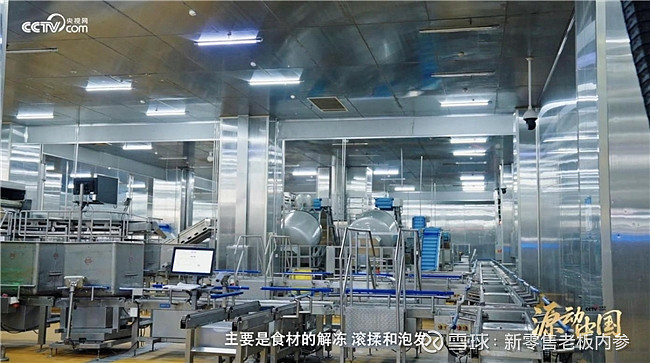 经过风淋间严格消杀,身着洁净工作服的主持人和王建进入备料车间,解冻、滚揉、泡发等环节在自动化设备的操作下精准运行。整个生产流程已实现最大程度的自动化与智能化:仓储环节采用自动化立体仓库,实现分区存储、自动控温,保障食材“先进先出”;生产环节联合设备厂家定制多款智能装备,打破传统制造瓶颈,大幅提升生产效率。