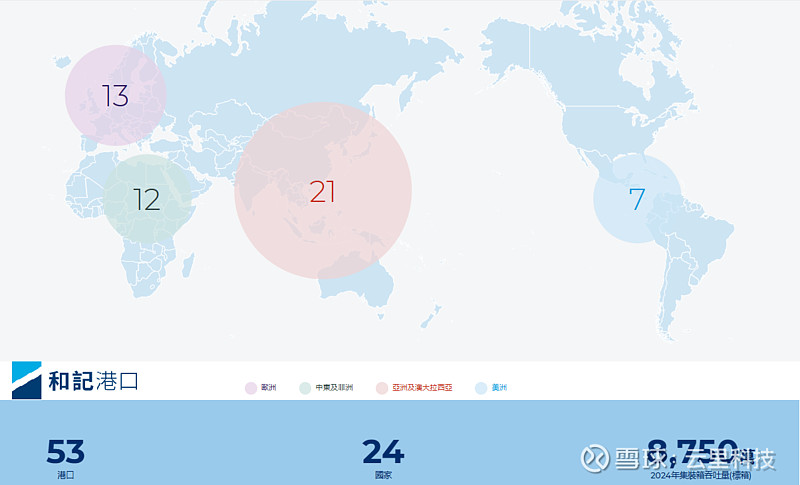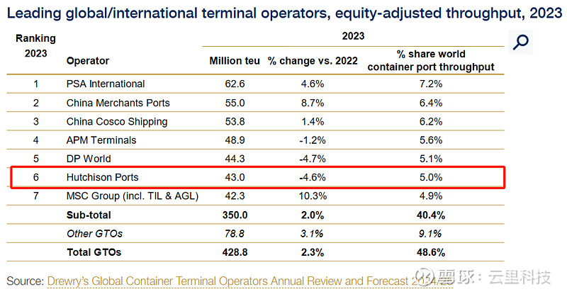 3、根据咨询公司德鲁里(Drewry)的数据,按权益份额调整后,和记港口集团在2023年完成集装箱吞吐量4,300万标箱,全球排名第六位;