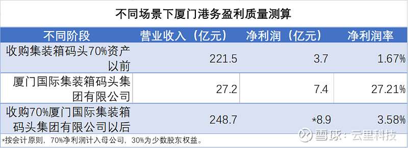 而厦门港务计划收购的厦门集装箱码头集团有限公司在2024年完成集装箱吞吐量1,225.5万标箱;实现营收27.2亿元,录得利润总额7.4亿元,利润率27.2%(注5)。盈利质量似乎差不太多(注6)。然而,合并厦门港务现有的业绩(在2024年实现营收221.5亿元,利润总额3.7亿元)之后,厦门港务的营业收入会增加到248.7亿元,而利润总额则为8.9亿元(注6,70%*7.4亿元,其余30%为少数股东权益,不计入利润额),利润率大幅降至仅3.6%(如果剔除1.9亿元的政府补助收益,那么利润率将萎缩至2.8%)。