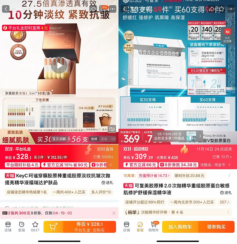 「创业最前线」对比主流电商平台数据发现,珂谧天猫旗舰店销量最高的穿膜重组胶原淡纹抗皱次抛精华液,定价600元/56支(单支均价10.7元),叠加双11促销活动后售价进一步下探至332元/56支(单支均价5.93元)。