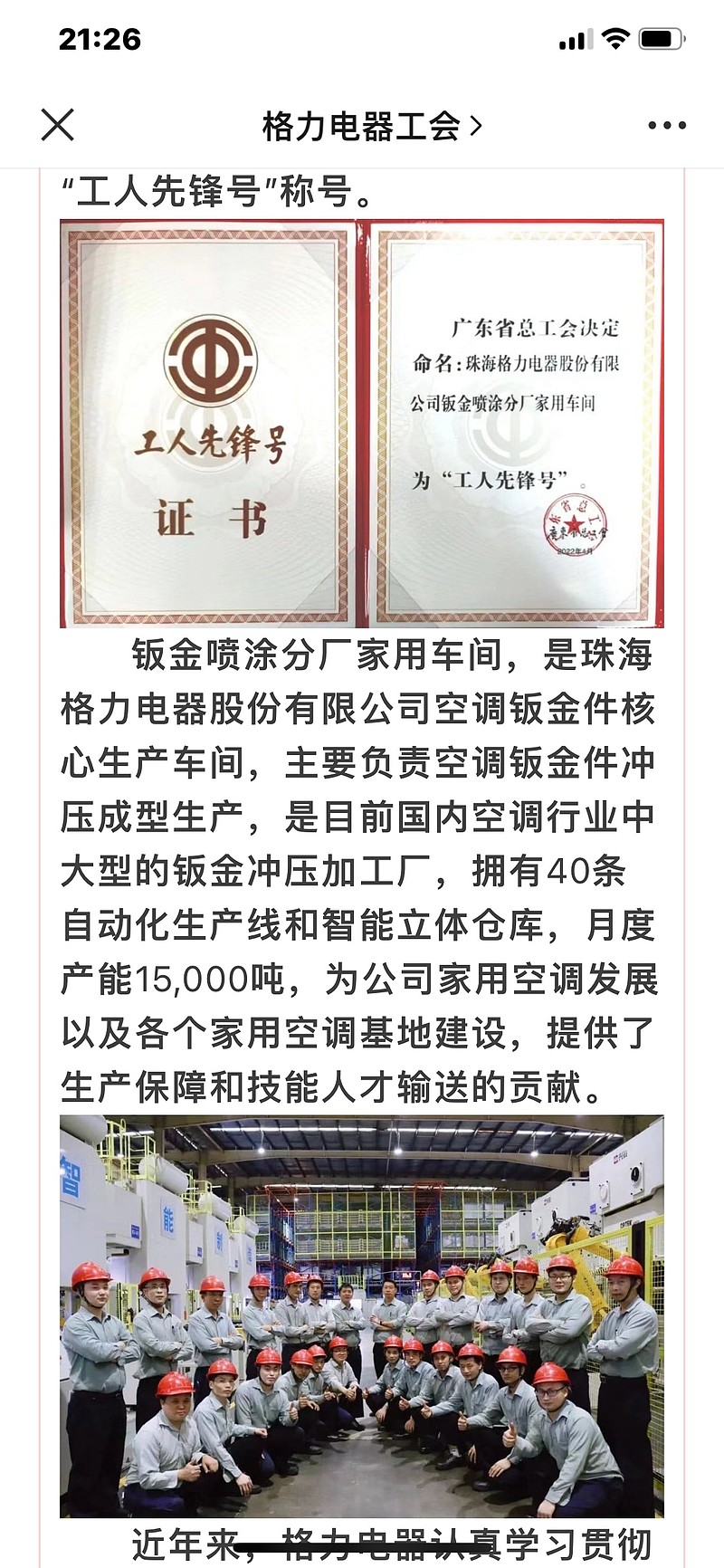 钣金喷涂分厂家用车间,是珠海格力电器股份有限公司空调钣金件核心生产车间,主要负责空调钣金件冲压成型生产,是目前国内空调行业中大型的钣金冲压加工厂,拥有40条自动化生产线和智能立体仓库,月度产能15,000吨,为公司家用空调发展以及各个家用空调基地建设,提供了生产保障和技能人才输送的贡献。