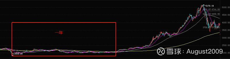 从这两张图,可以看到,2005年998之后,股指在1000-1100点之间磨了半年之久,2013年1849之后,股指在2000点上下,横盘一年之久。